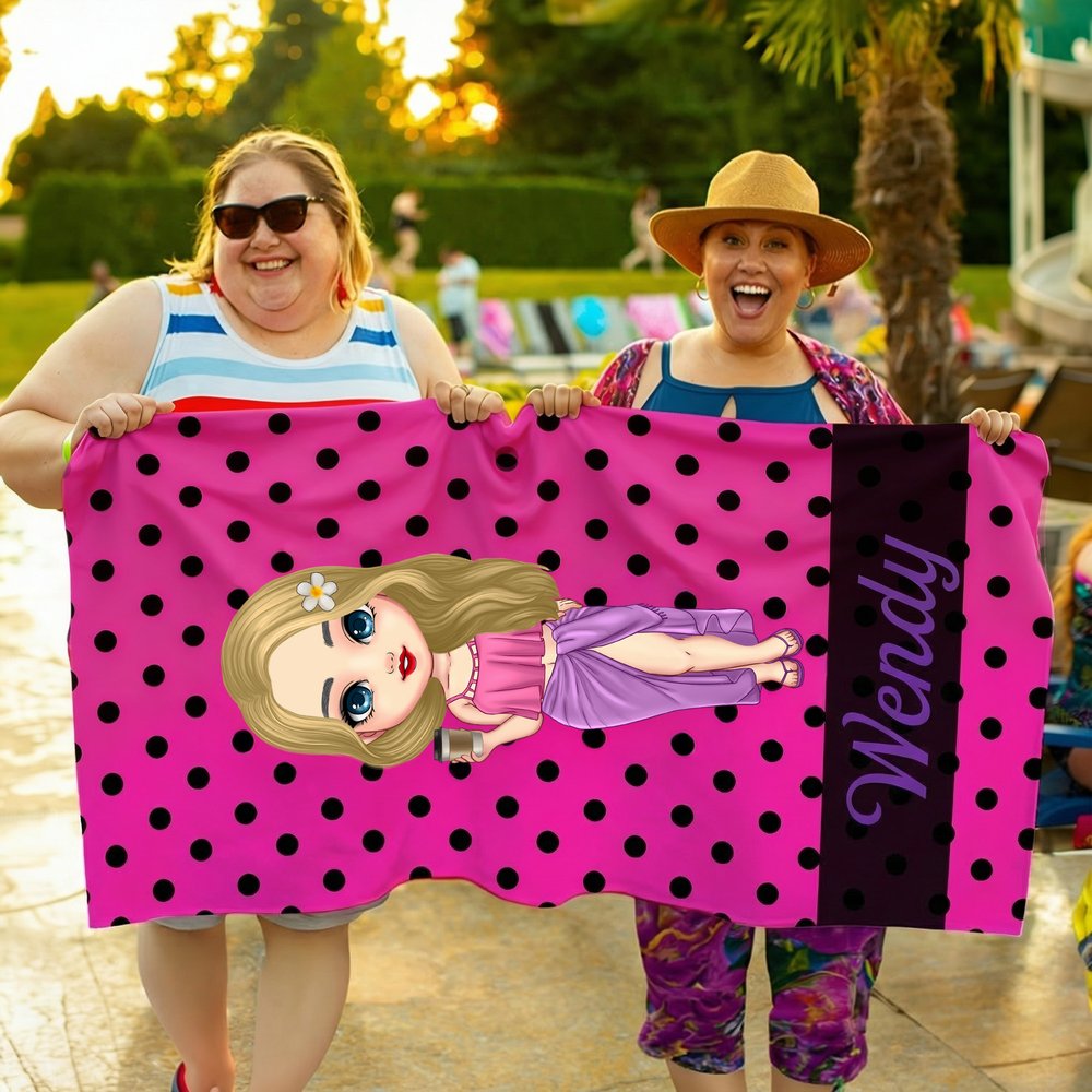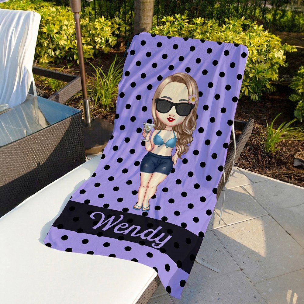 Tämä elinvoimainen rantapyyhe tarjoaa täysin yksilöllisen muotoilun, joka sopii jokaiseen ainutlaatuiseen persoonallisuuteen. Voit valita söpön chibi-tyylisen sarjakuvahahmon suunnittelun, joka on räätälöity vastaanottajalle, lisätä mukautetun nimen tyylikkäällä kaunokirjoituskirjoituksella alareunaan ja valita iloisen pilkullisen taustavärin luodaksesi ainutlaatuisen kesäisen lisävarusteen.