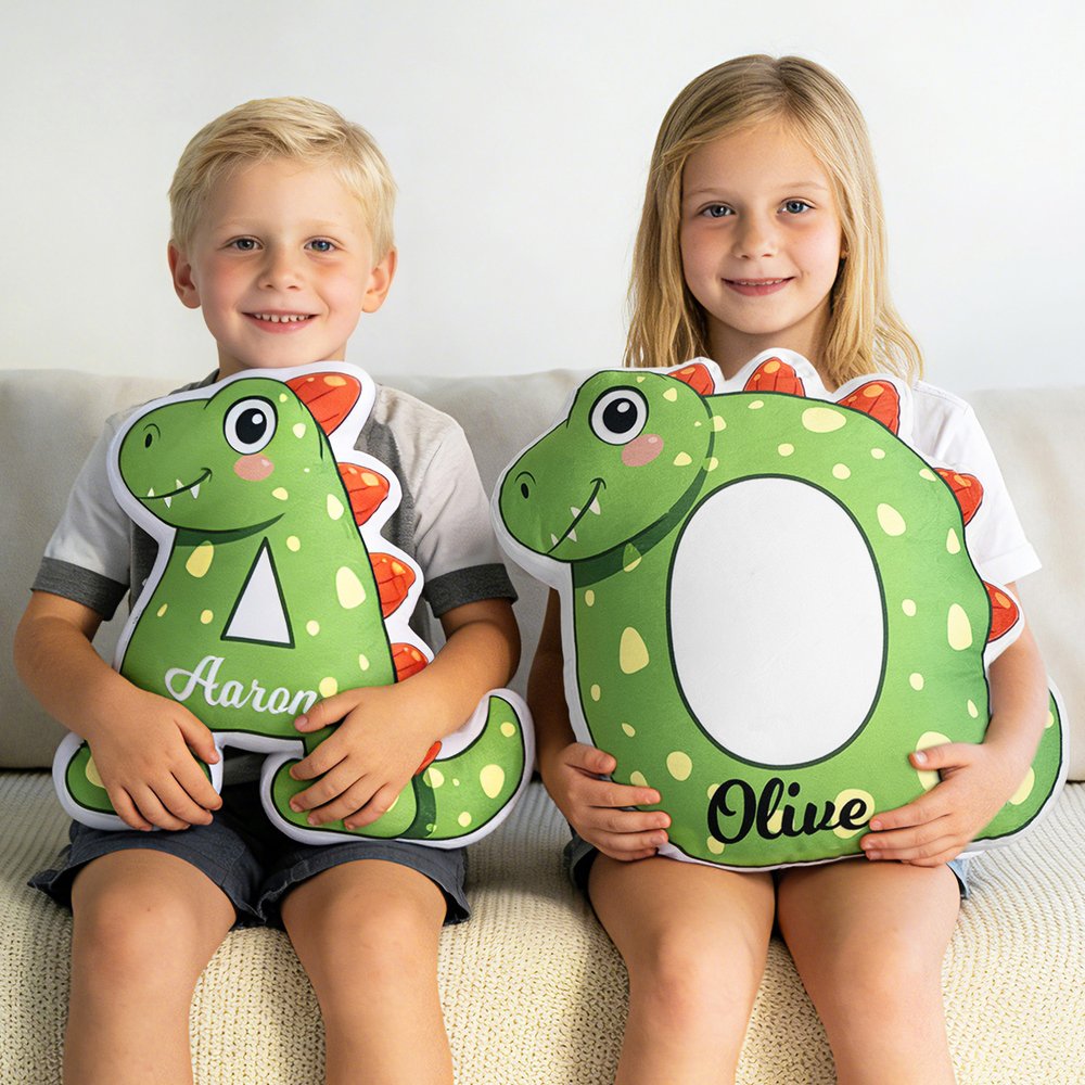 Tässä tyynyssä on sarjakuvamaisia dinosauruksia, yksilöllisiä kirjaimia ja nimiä keskeisinä elementteinä, ja siinä on pyöristetty, ystävällinen muotoilu, jossa ei ole teräviä reunoja, mikä takaa turvallisuuden ja söpöyden. Yleinen värimaailma on pääasiassa vihreä, jossa on keltaisia täpliä, mikä luo raikkaan ja eloisan ilmeen.