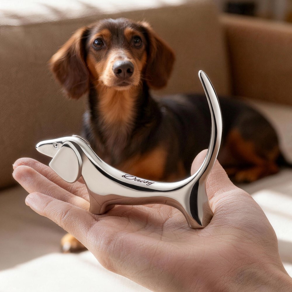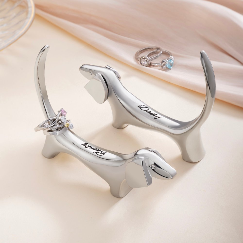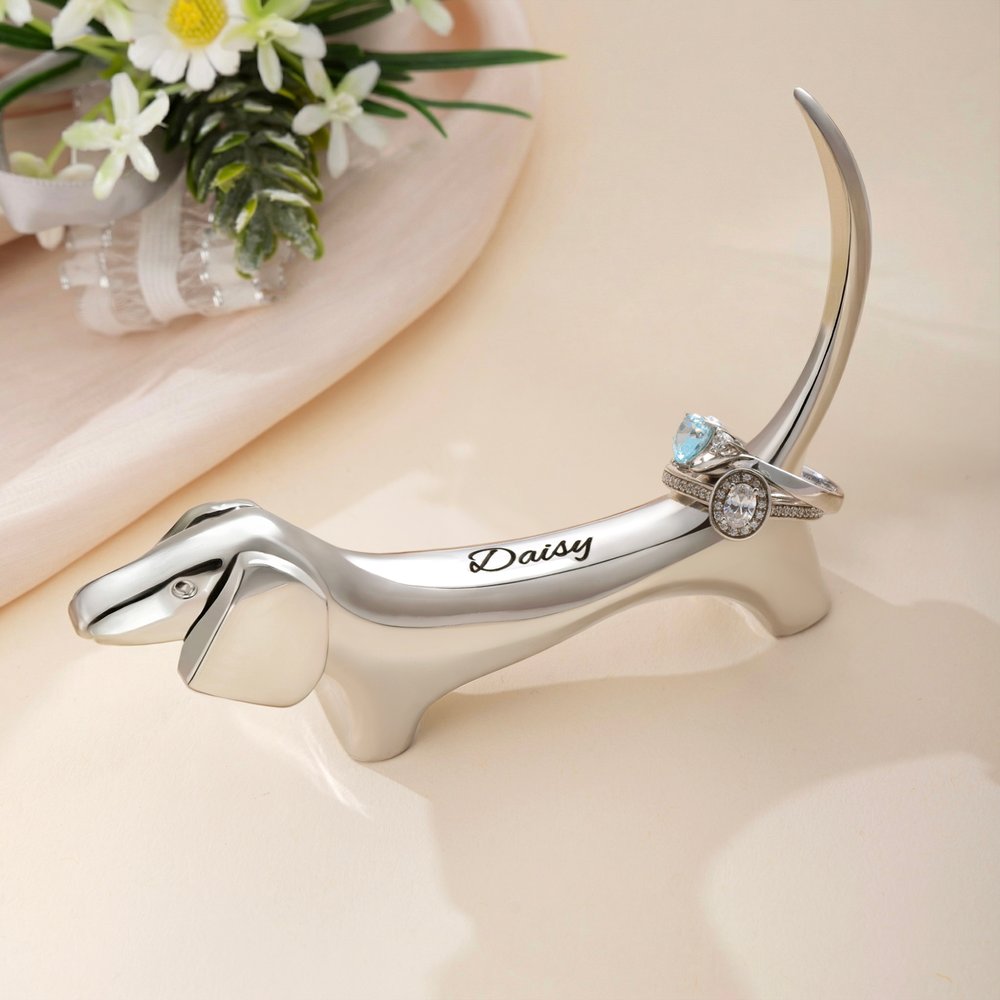 Tämä viehättävä sormuksenpidin on saanut inspiraationsa vastustamattoman ihastuttavasta mäyräkoirasta, ja se vangitsee vaivattomasti koiran vilkkaan viehätyksen ja lämmittävän, parantavan tunnelman. Siinä on harkitusti suunniteltu yksinoikeudella kaiverrusalue takana, ja se yhdistää kauniisti henkilökohtaisen säilytyksen ja syvän tunnearvon.