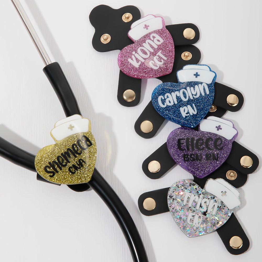 Tässä tunnisteessa yhdistyvät muoti ja käytännöllisyys. Hohtava sydänkuvio yhdistyy sairaanhoitajan lippalakki-elementtiin, joka osoittaa hoitotyön ammattitaitoa ja lämpöä. Se tukee nimien ja asemien mukauttamista yksinoikeudellisten merkkien luomiseksi, mikä on ihanteellinen valinta jokaiselle hoitohenkilökunnalle persoonallisuuden ja ammattiylpeyden osoittamiseksi.