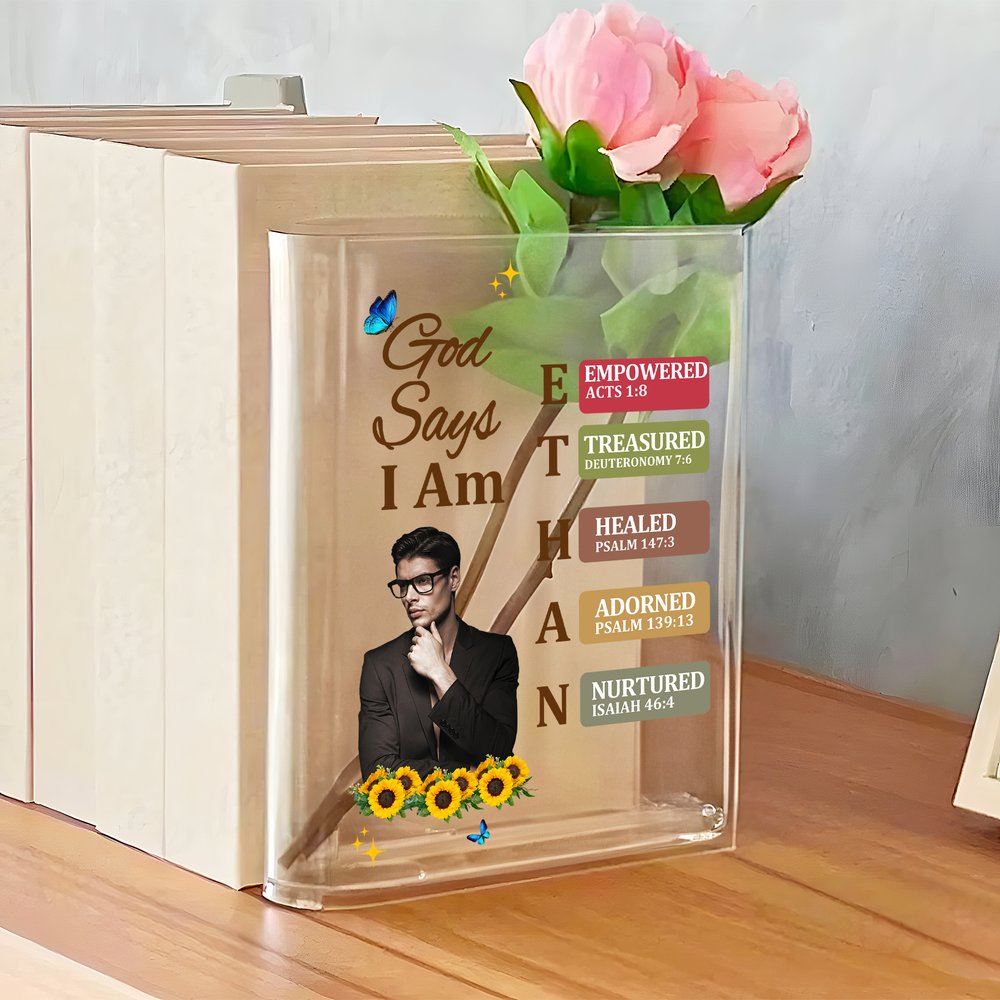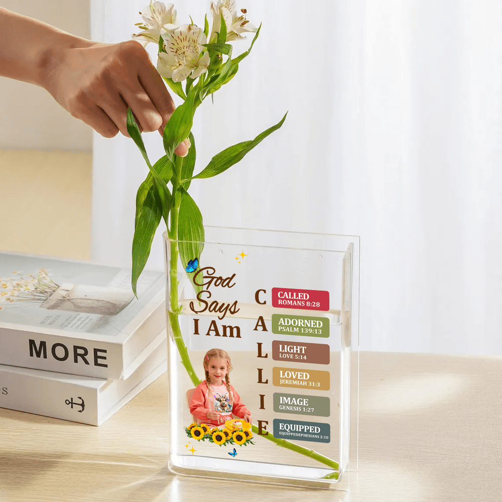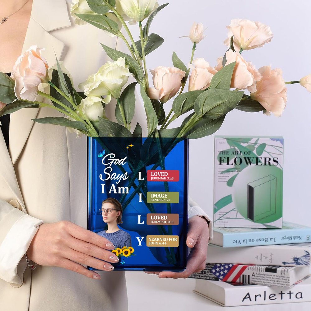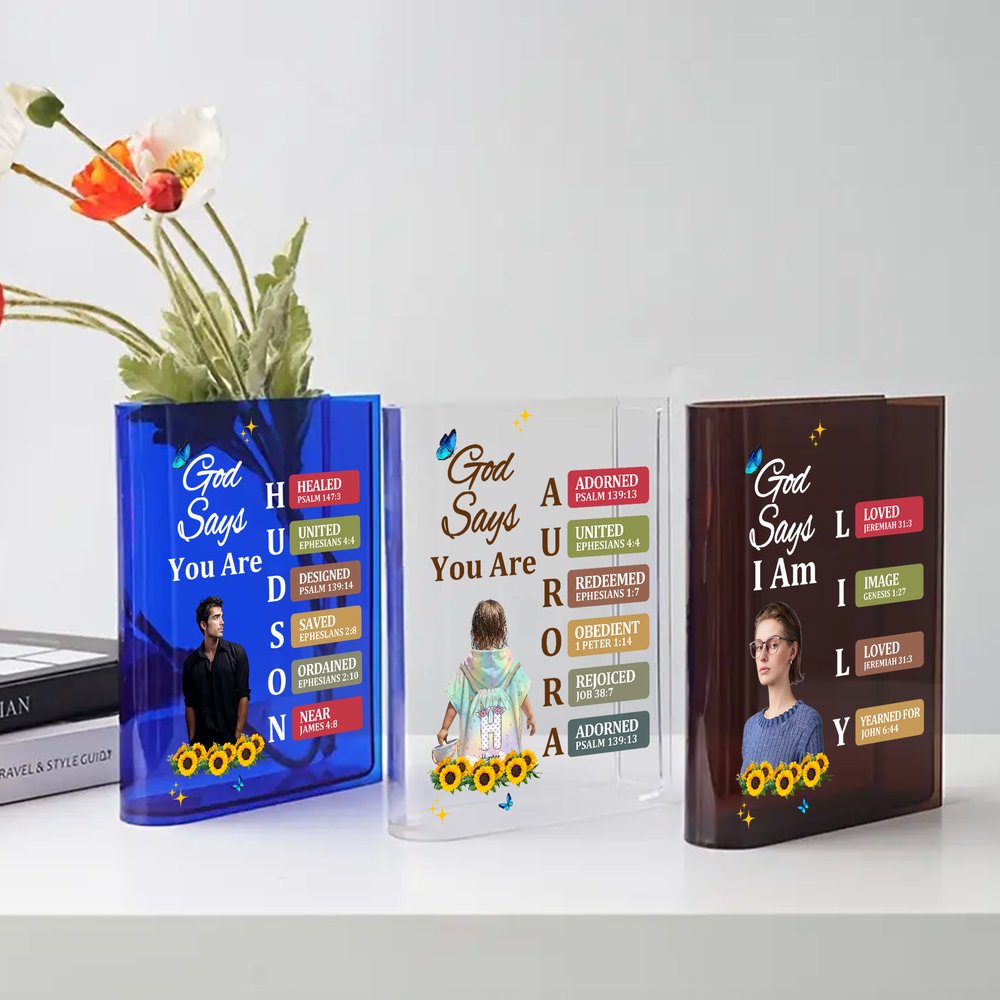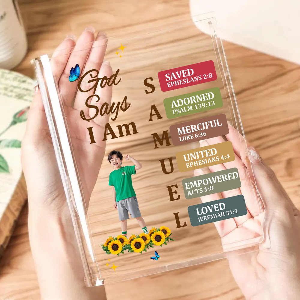 Tässä läpinäkyvässä kirjassa, jossa on Raamatun jakeet "Jumala sanoo, että minä olen" tai "Jumala sanoo, että sinä olet", ja joka on muokattavissa valokuvilla ja nimillä, on elegantti ja taiteellinen viehätysvoima, jossa lukeminen ja estetiikka yhdistyvät ainutlaatuiseksi ja ikimuistoiseksi lahjaksi.