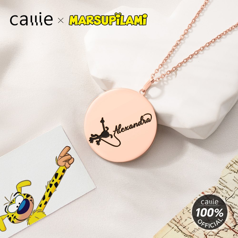 Minimalistisen pyöreän muotoinen kaulakoru on suunniteltu kolmella eri viimeistelyllä: hopea, kulta ja ruusukulta, ja se tarjoaa monipuolisia vaihtoehtoja, jotka täydentävät erilaisia asustustyylejä. Marsupilami-siluetin ja räätälöidyn nimen yhdistelmä säilyttää sarjakuvahahmon ihastuttavan viehätyksen ja lisää korun eleganssia hienostuneen metallityön avulla. Se on hienovarainen mutta erottuva jokapäiväiseen käyttöön.