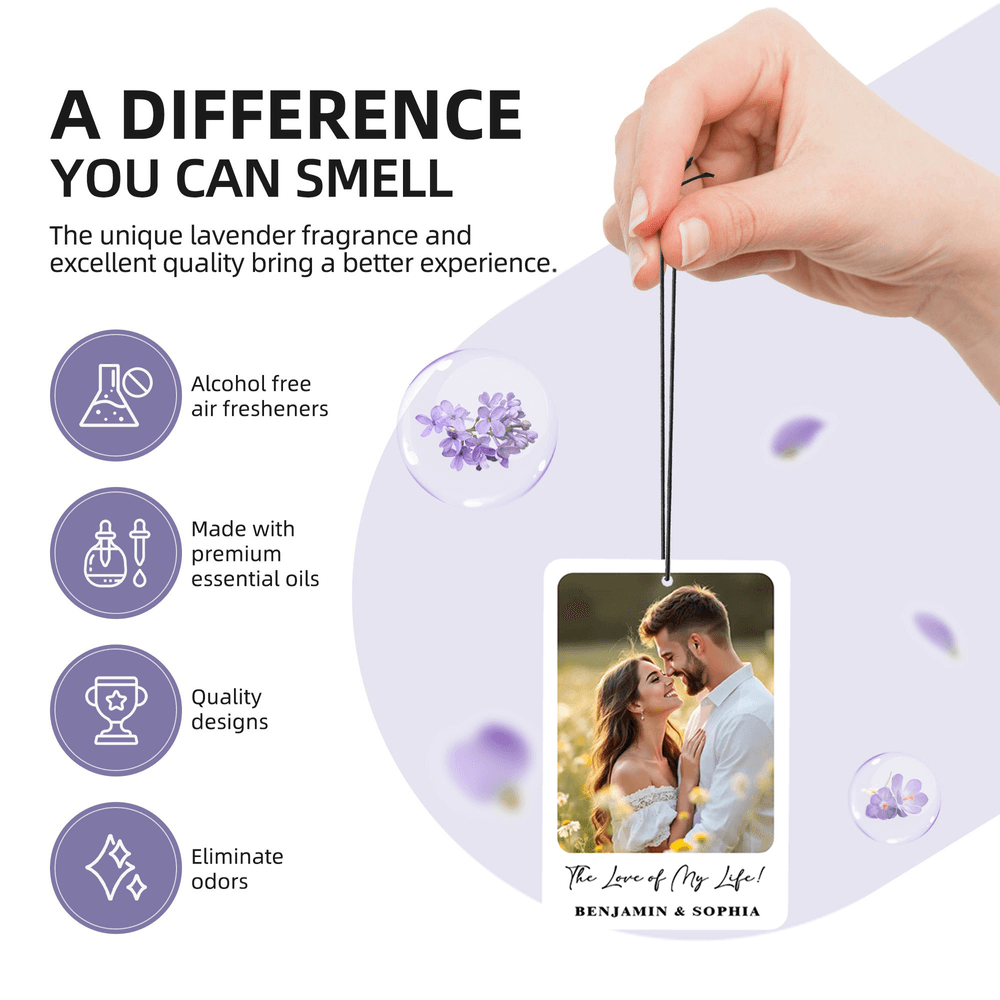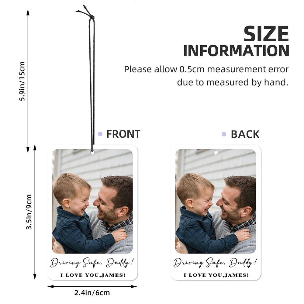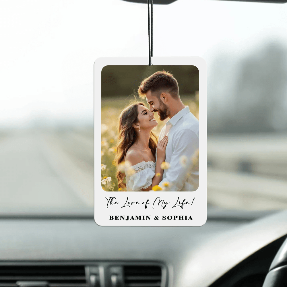 Tämä auton ilmanraikastin on saanut inspiraationsa rakkaista hetkistä, ja se toimii romanttisena keskipisteenä millä tahansa matkalla. Muotoilussa on klassinen suorakulmainen kortti, jossa on kauniisti esillä lataamasi henkilökohtainen valokuva. Kuvan alle voit lisätä merkityksellisiä viestejä romanttisella, käsinkirjoitetulla kirjasintyylillä. Yhdistämällä suosikkikuvan ja henkilökohtaisen tekstin muutat toiminnallisen lisävarusteen ainutlaatuiseksi kertomukseksi yhteydestä.